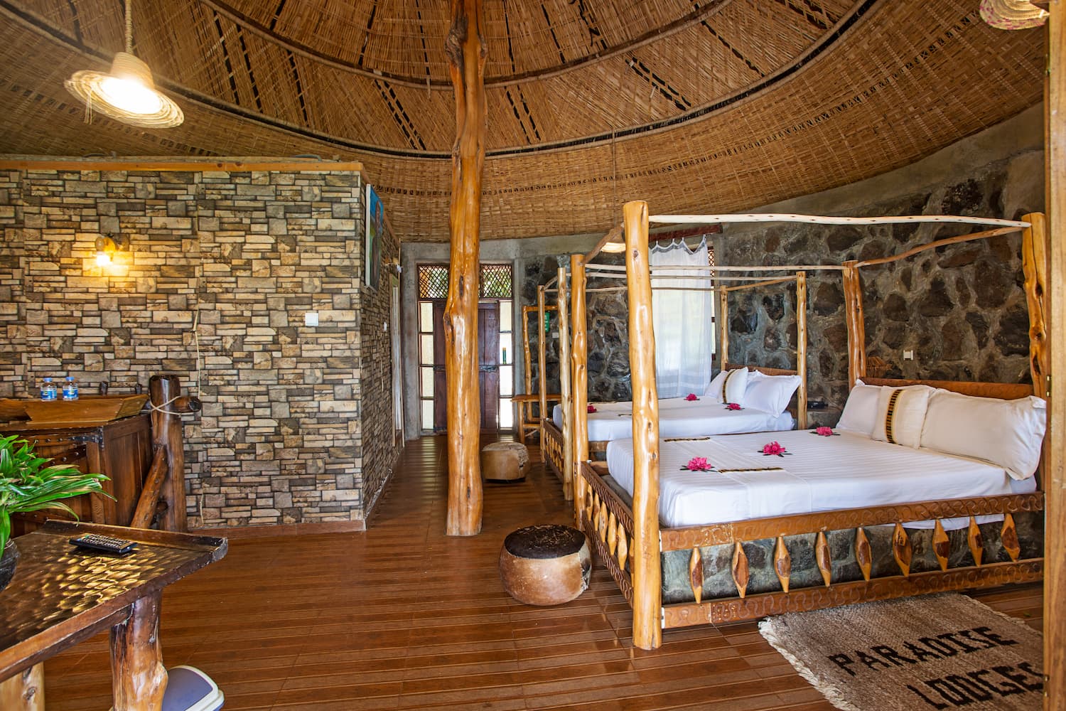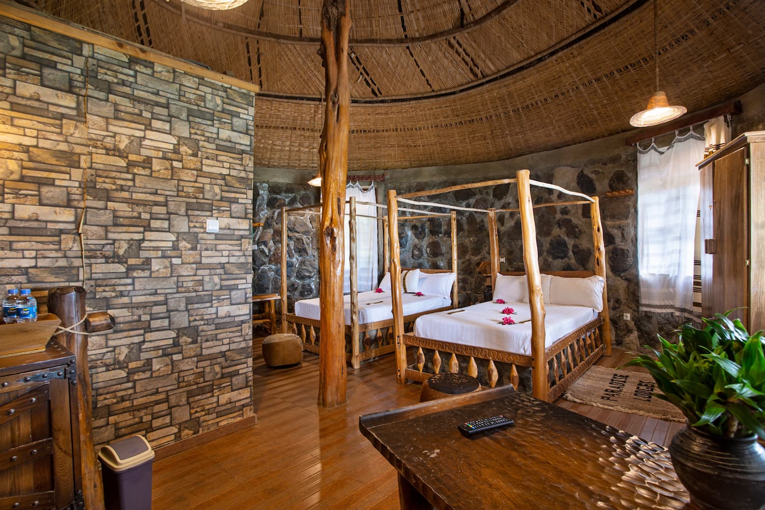 Our signature "Tukul" architecture room design constructed in conical (rondavel) shapes using natural materials, such as wooden poles and grass or straw thatching makes these rooms stunning! The walls are often made from stone, creating a sturdy and insulating structure. The roofs are steeply sloped to ensure rainwater runoff and are crafted with intricate patterns using the savannah grass as the thatching material of choice.